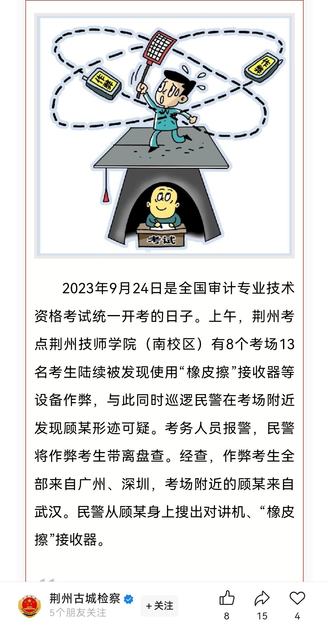 4天后,荆州人社局官网通报了这起作弊案,表示现场抓获15名作弊考生,场外抓获一名组织团伙成员。