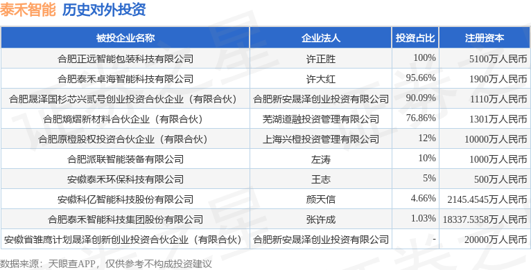 本站消息,根据天眼查APP显示,泰禾智能(603656)新增一起对外投资事件,被投资公司为合肥泰禾智能科技集团股份有限公司,法定代表人张许成,投资占比为1.03%。该公司从事专用设备制造业创元网配资,注册资本为18337.5358万人民币。目前创元网配资,泰禾智能共存在对外投资10项,详见下表: