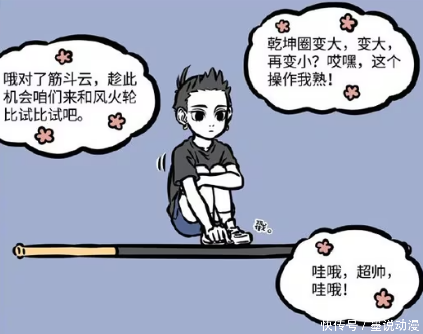孙悟空还提出要用风火轮跟筋斗云比试,看谁的速度更快。乾坤圈还能变大变小,孙悟空对这种使用方式不要太熟悉。孙悟空觉得自己超帅,玩哪吒的武器那是得心应手。虽说最后哪吒动了一下财惠赚,但也只是戳了金箍棒,想让它有点变化,可惜最终都没有。