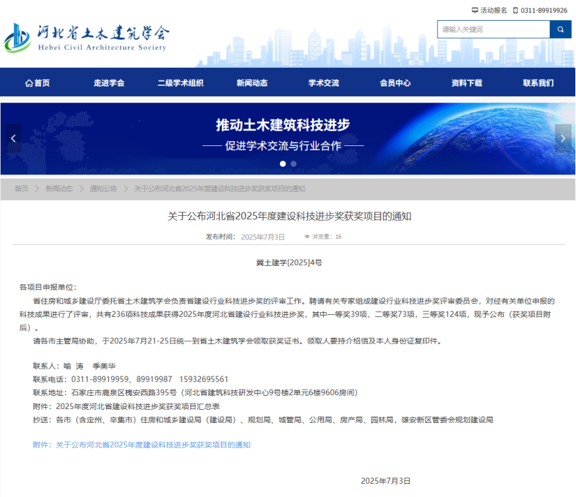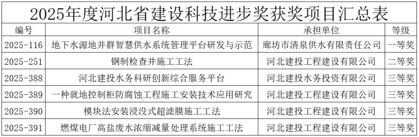 近日,由河北省住房和城乡建设厅组织的省建设行业科技进步奖评审结果揭晓,建投水务6项科技项目荣获河北省建设科技进步奖,共获得一等奖1项、二等奖1项、三等奖4项。其中,廊坊清泉供水有限责任公司申报的《地下水源地井群智慧供水系统管理平台研发与示范》项目斩获一等奖。