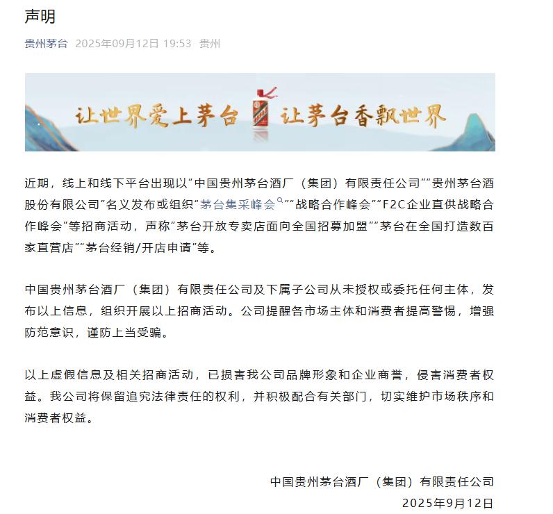 中国贵州茅台酒厂(集团)有限责任公司表示,公司及下属子公司从未授权或委托任何主体,发布以上信息,组织开展以上招商活动。公司提醒各市场主体和消费者提高警惕,增强防范意识,谨防上当受骗。