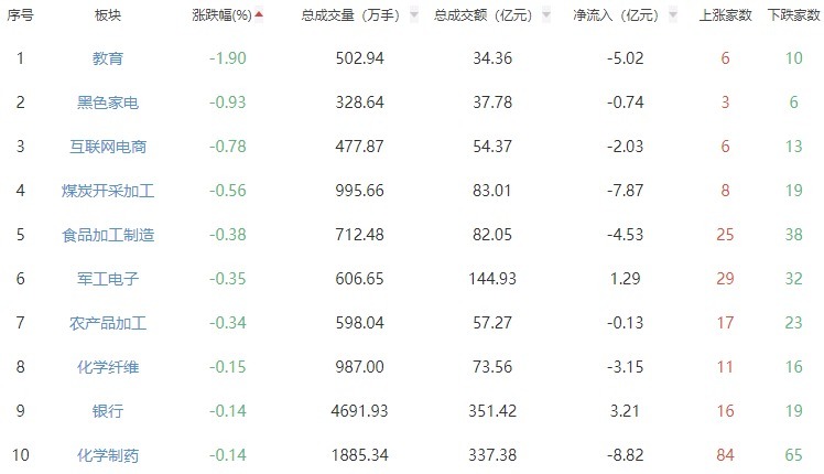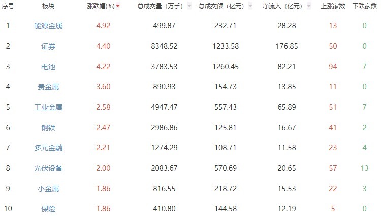 板块方面,能源金属、证券、电池等板块涨幅居前,教育、黑色家电、互联网电商等板块跌幅居前。