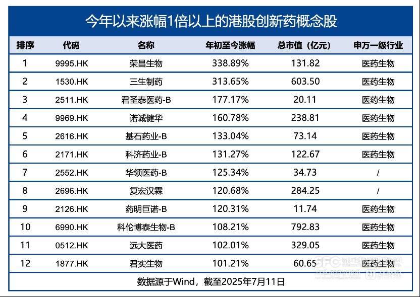 资本市场的表现尤为亮眼。截至今年6月30日,万得创新药概念指数涨超21%,恒生港股通创新药指数涨超66%。上半年回报TOP10的公募基金中,有7只都重仓了创新药。港股创新药表现更为突出,截至7月11日,今年以来有12只港股创新药概念股涨幅翻倍,其中荣昌生物和三生制药涨幅甚至超过300%。