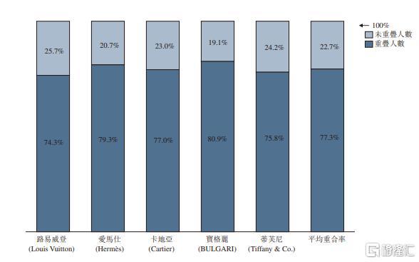 老铺在财报中披露:其消费人群中与路易威登、爱马仕、卡地亚、宝格丽、蒂芙尼五大奢侈品牌重叠度高达 77.3%。具备高端消费特点,验证了品牌的高端定位。