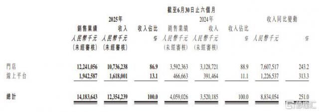 截至 2025 年 6 月 30 日,在 16 个城市拥有 41 家自营门店,上半年新开 5 家门店(含新加坡首店)。同店销售增长 243%,单店平均半年收入约 4.59 亿元。