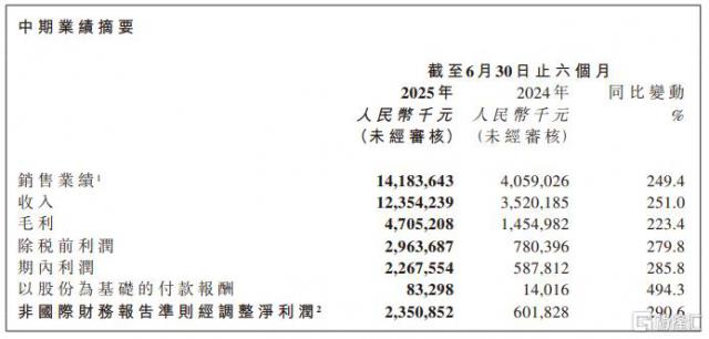 8 月 20 日,老铺黄金发布截至 2025 年 6 月 30 日止六个月中期业绩显示,上半年公司实现营收 123.54 亿元,同比增长 251.0%;期内利润 22.68 亿元,同比增长 285.8%;非国际财务报告准则经调整净利润更是高达23.51 亿元,同比大增 290.6%。