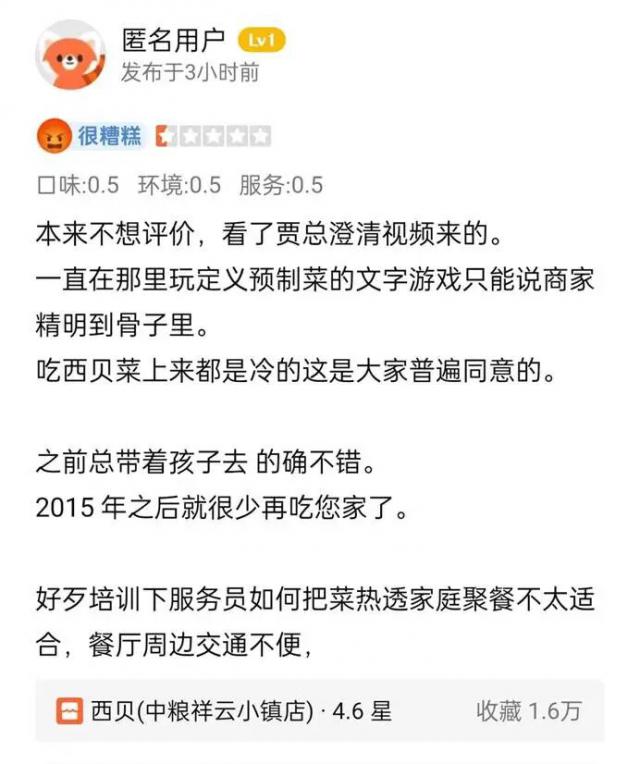 而有人看到贾国龙的回应后,特意跑到罗永浩去过的那家西贝店留言:"一直在那里玩定义预制菜的文字游戏,只能说商家精明到骨子里",最后还忍不住建议 "好歹培训下服务员如何把菜热透"。