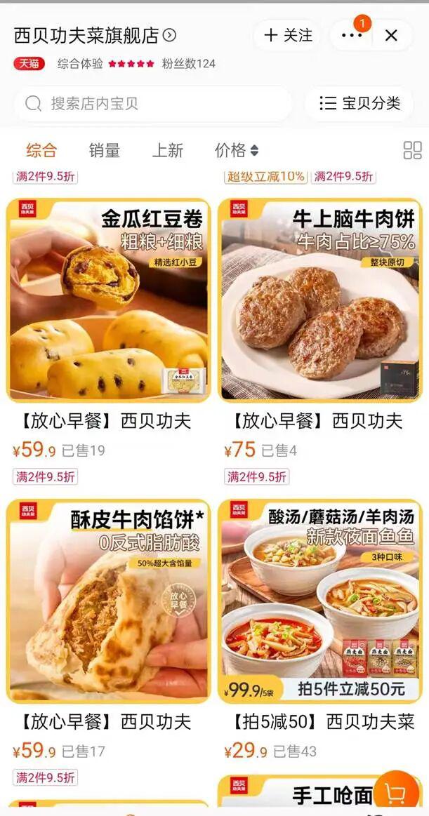 目前,天猫西贝功夫菜旗舰店销量商品多为早餐,销量最高的为"有机莜面鱼鱼",只有 100 多单,最低的牛上脑肉饼只有 4 单。