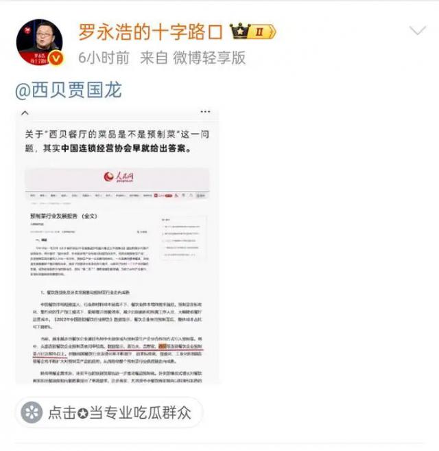 9 月 12 日,罗永浩转发一条转发人民网报道的图片再次喊话贾国龙,其晒出预制菜行业发展报告显示,西贝等连锁餐饮企业预制菜占比达 80% 以上,直接用数据对西贝的" 100% 无预制菜"表态提出质疑。