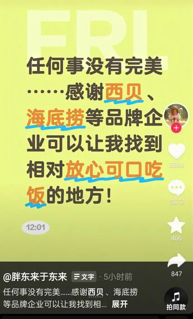 就连胖东来的 CEO 于东来,也在社交媒体上发文说:"任何事没有完美 …… 感谢西贝、海底捞等品牌企业可以让我找到相对放心可口吃饭的地方!"