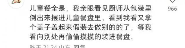有网友目睹了这样一幕:厨师从包装里把食材倒出来,摆进儿童餐盘,察觉到自己在看,又赶紧拿个盖子盖起来,假装去忙活别的事,等自己把目光移开,才又偷偷摸摸地把食材装进餐盘。