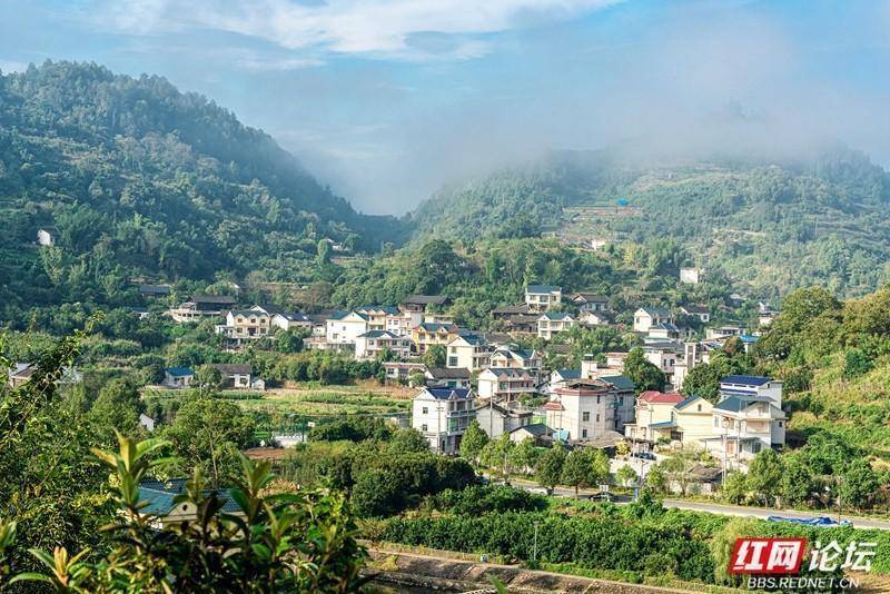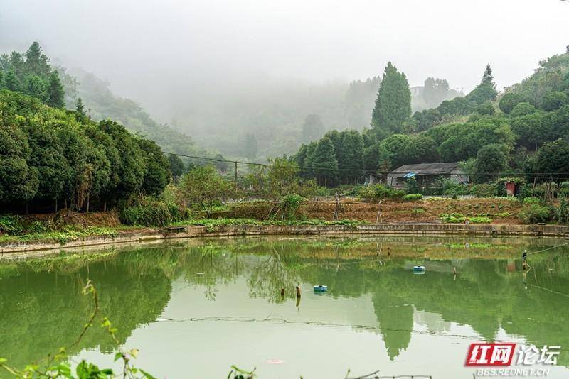 湘西的山风识得每一个早行的人。(图文/红网论坛@迷底)放眼望去,青瓦木屋错落于苍翠山间,倒映在澄澈如镜的水面,宛如一幅徐徐展开的山水长卷。溪水潺潺,绕村而过,河畔绿树成荫,偶有身影临水而动,为这静谧的晨光添上几笔灵动的气息。远处,田野间稻浪轻涌,墙角的瓜果初熟,枝头沉坠的果实沾着露珠,在晨光中闪烁如星,默默诉说着大地的丰饶与希望。