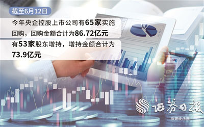 今年以来,央企控股上市公司回购、股东增持稳步推进。据Wind资讯数据统计,截至6月12日,今年央企控股上市公司有65家实施回购,回购金额合计为86.72亿元;有53家股东增持,增持金额合计为73.9亿元。综合来看,央企控股上市公司回购、股东增持金额合计达160.62亿元。